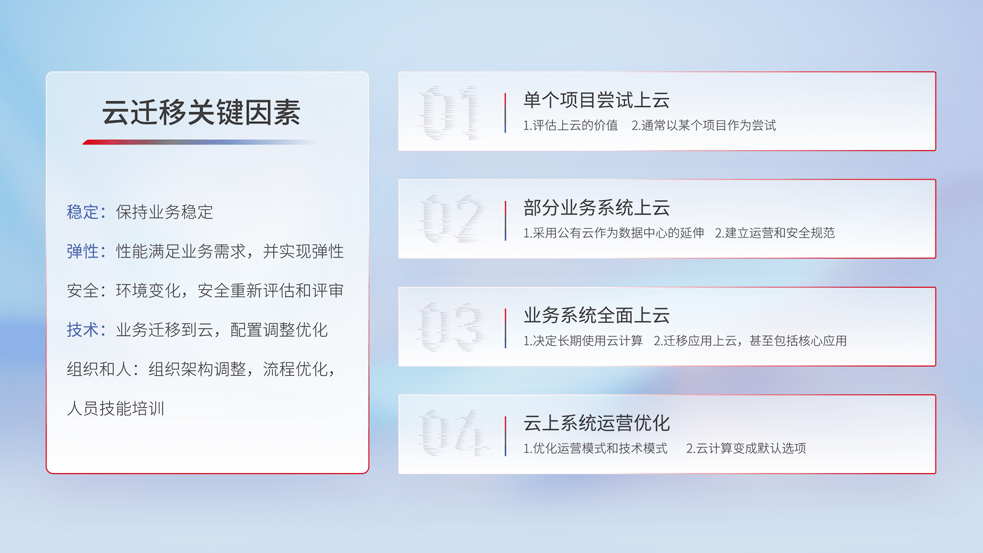 结合实际业务,,,从规划设计、、、、云平台选型、、、云原生改造、、、数据迁移、、、集成交付,,迁移全过程为客户识别最佳上云路径,,,,做好风险识别管理,,设计网络架构、、身份权限、、、安全审计合规、、、操作审计、、日志审计、、监控告警策略、、多站点容灾设计等,,,对云上基础设施进行整体规划,,,提升IT治理水平,,以满足弹性、、、高可用、、、、高性能的需求。。。