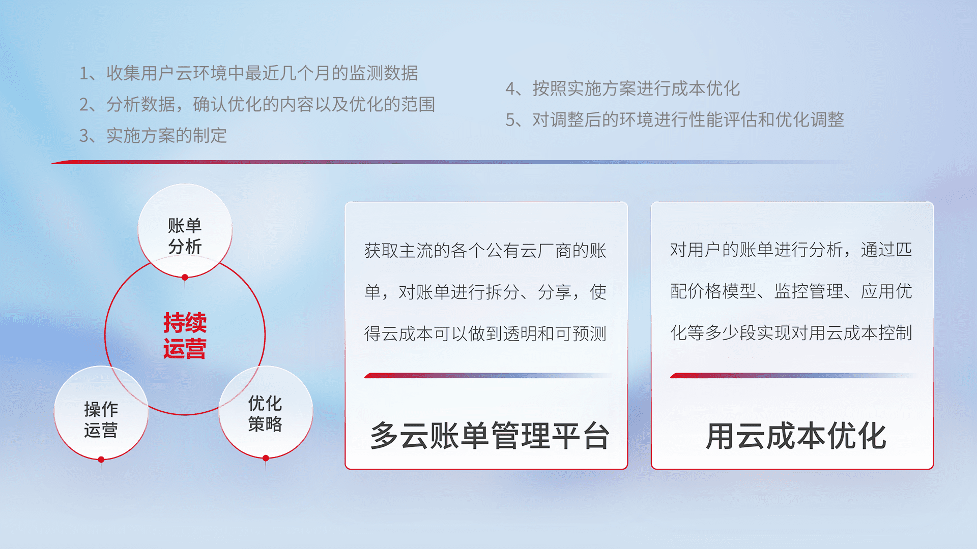 通过多云纳管,,,,以统一的资源数据模型把客户的云资源进行抽象和封装,,进而实现对多云资源的统一操作,,保障云资源管理的可靠性、、、、稳定性与可用性。。。量身定制化运维内容,,配置、、开发运维、、补丁管理、、、、备份、、、、监控、、认证和访问管理、、、、审计和日常巡检等,,,保障在用云过程中的可靠度,,,稳定度以及高可用率。。。。
